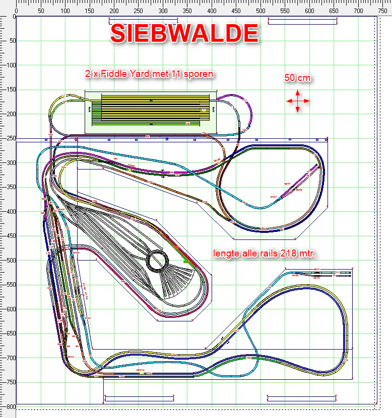 Overzicht van de complete baan inclusief fiddle yards en locomotiefdepot.
